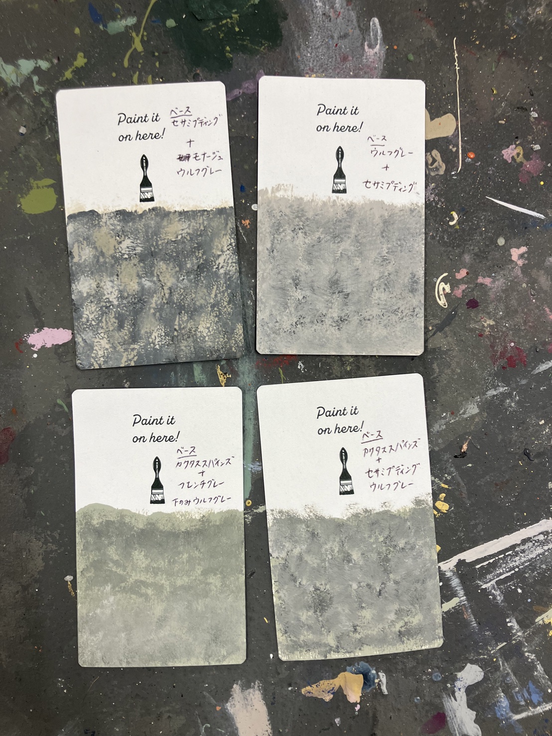 ウルフグレーをベースに、セサミプディング・モナージュ・カクタススパインズ・フレンチグレーで何種類かエフェクト塗装を試していただいた結果、