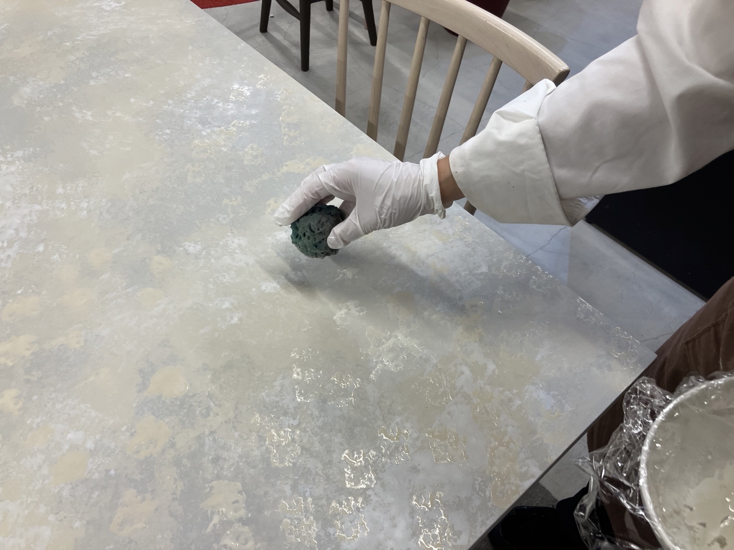 ご相談をいただいた際、エフェクト塗装は壁に塗るご予定でしたが、今回はお試しでテーブルの天板に塗る3色を選ばれました。机ででうまくできたら次は壁に挑戦されるそうです。