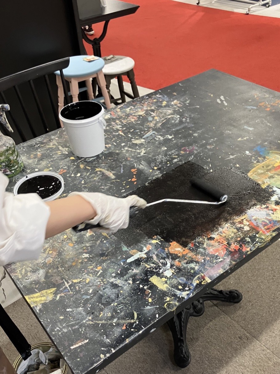 店内にディスプレイしている看板に書かれた『壁紙に塗れる』という言葉が気になったお客様がスタッフにお声をかけてくださいました。