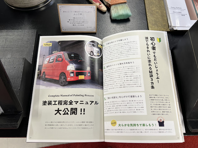 店頭ではムック本や塗装事例集、実際に塗装された車の一部等、お客様にイメージしていもらえるようにたくさんの資料やサンプルをご用意しております。